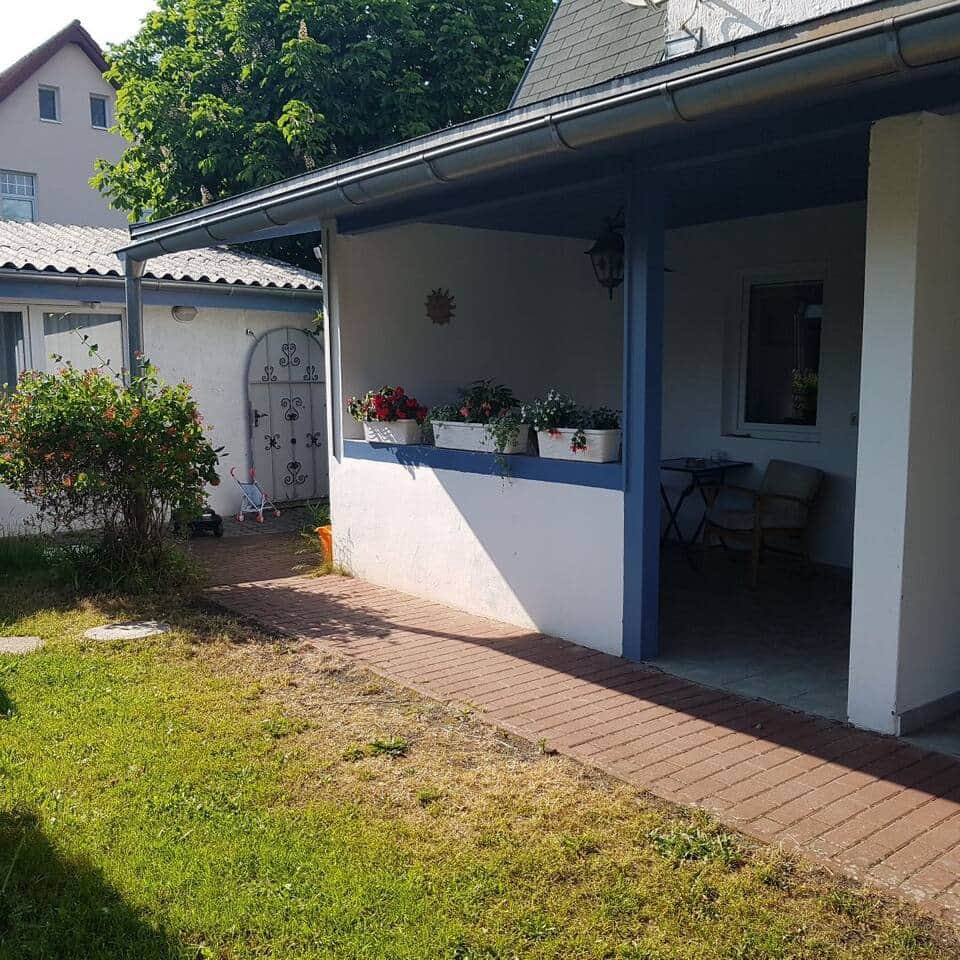 Blick auf den Innenhof mit der Terrasse Hiddensee rechts und Blick auf die Ferienwohnung Ruden