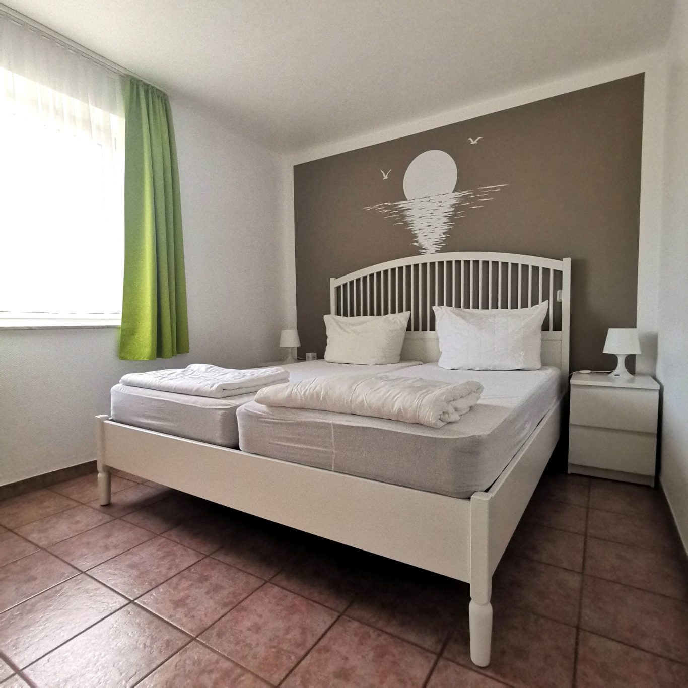 Sie betreten die Ferienwohnung und gelangen direkt ins behagliche Schlafzimmer ausgestattet mit einem Kingsizebett, Kleiderschrank und Kommode sowie einem Fernseher. Für erholsamen Schlaf sorgen Verdunklungsvorhänge.