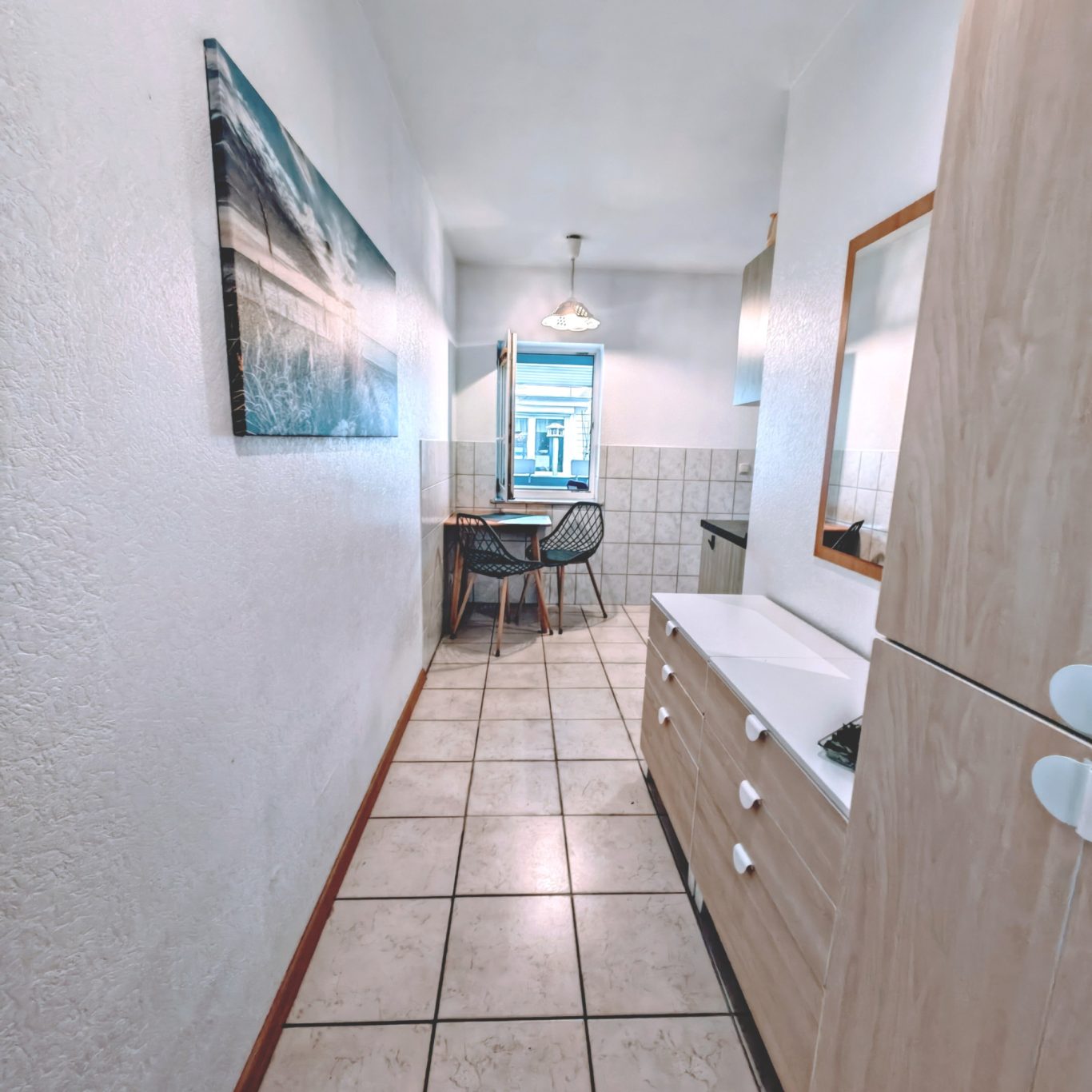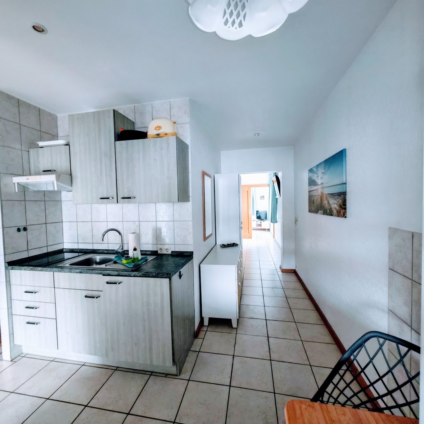 Sie bietet alles, was Sie brauchen: eine praktische Küchenzeile, einen Kühlschrank (ohne Gefrierfach), ein Cerankochfeld mit zwei Platten, Koch- und Essgeschirr, Besteck, Gläser, Wasserkocher, Kaffeemaschine und Toaster. Direkt daneben lädt eine gemütliche Essecke mit Tisch zu gemeinsamen Mahlzeiten ein.