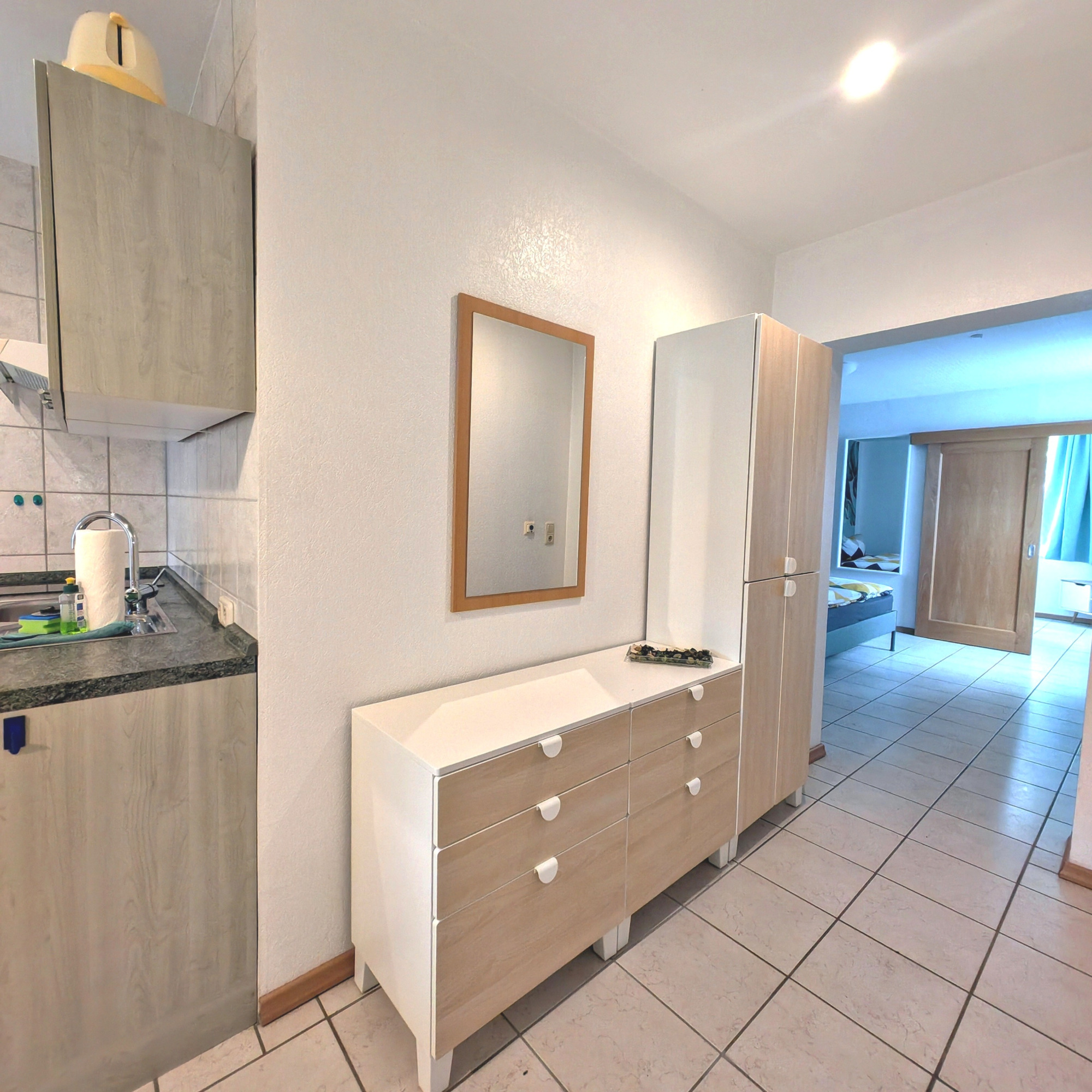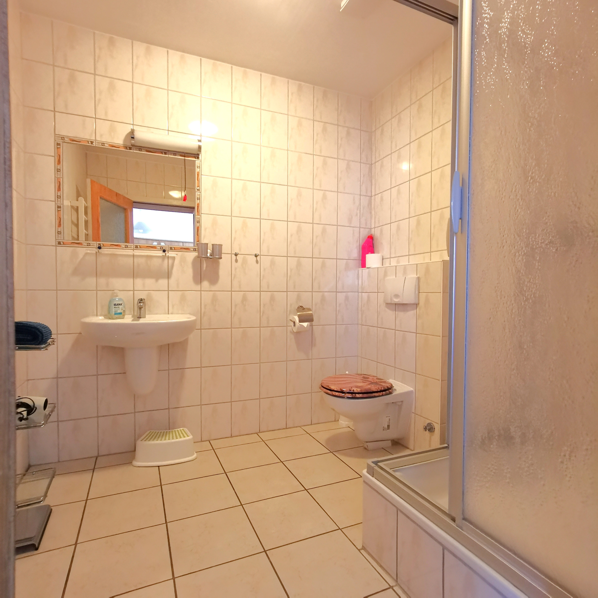 Direkt angrenzend finden Sie das Badezimmer mit Dusche, Wand- und Fußbodenheizung sowie einem Fön – für den perfekten Start in den Tag.