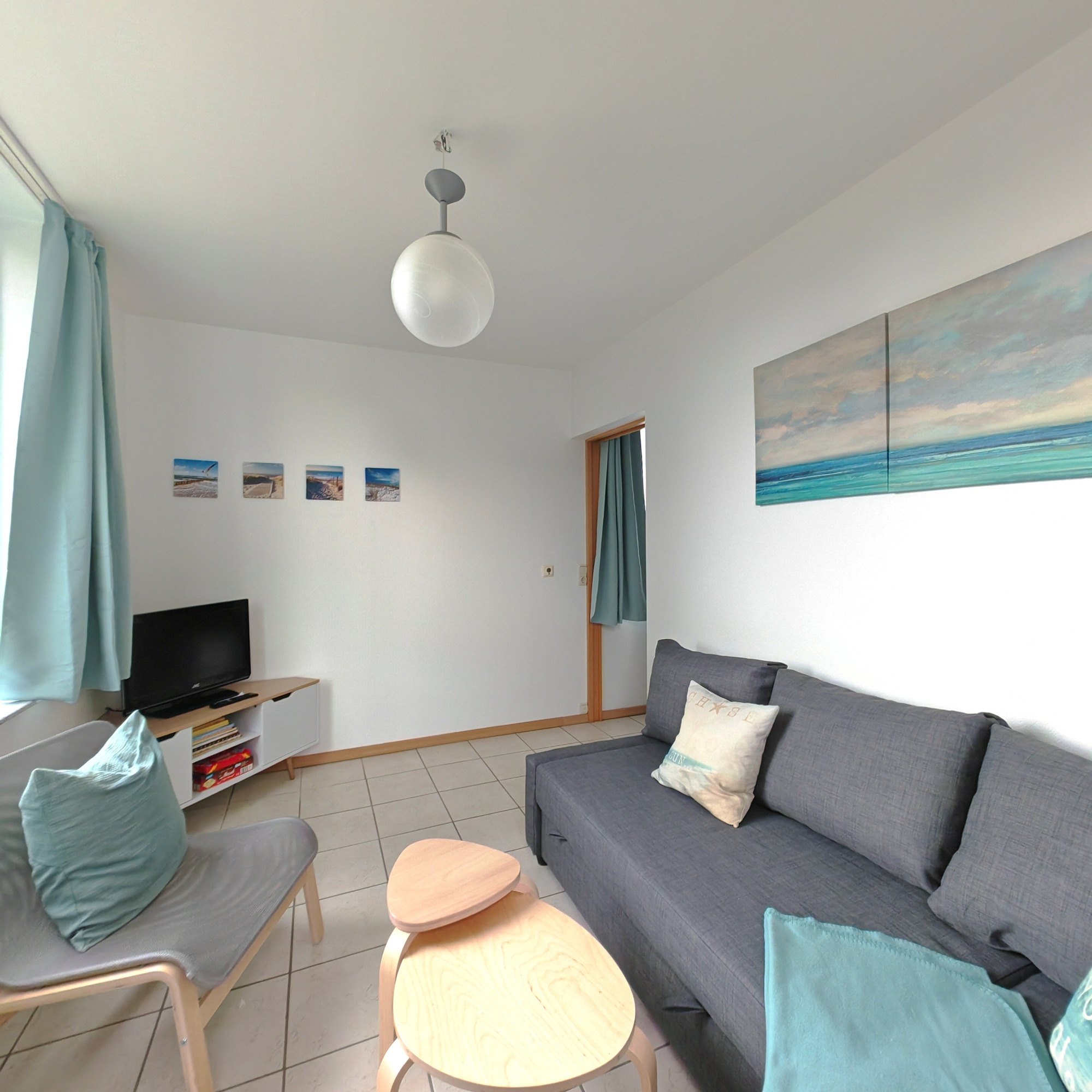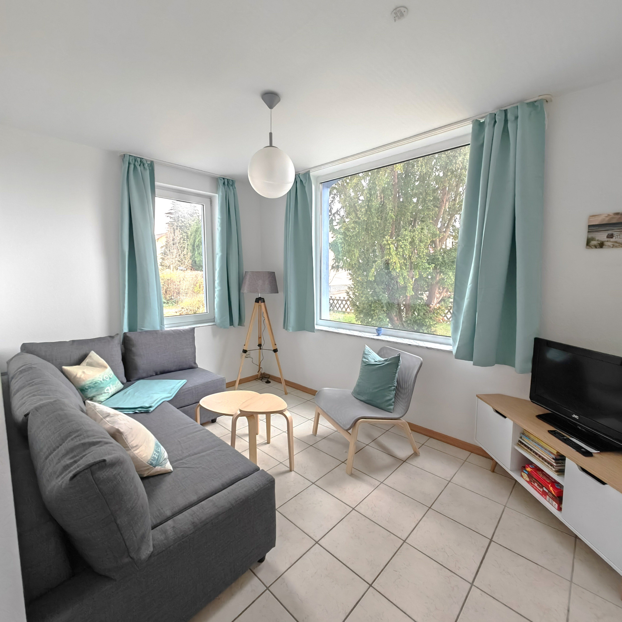 An das Schlafzimmer, abgetrennt durch eine Schiebetür, grenzt das behagliche Wohnzimmer. Die Couch verwandelt sich im Handumdrehen in eine Lümmelecke oder eine zusätzliche Schlafgelegenheit (ca. 130 x 190 cm)und lädt zum Kuscheln oder Schmökern in den bereitliegenden Büchern für Groß und Klein ein, und auch Gesellschaftsspiele sowie etwas Spielzeug sorgen für gemütliche Abende. Selbstverständlich steht Ihnen kostenfreies WLAN und ein Fernseher zur Verfügung.