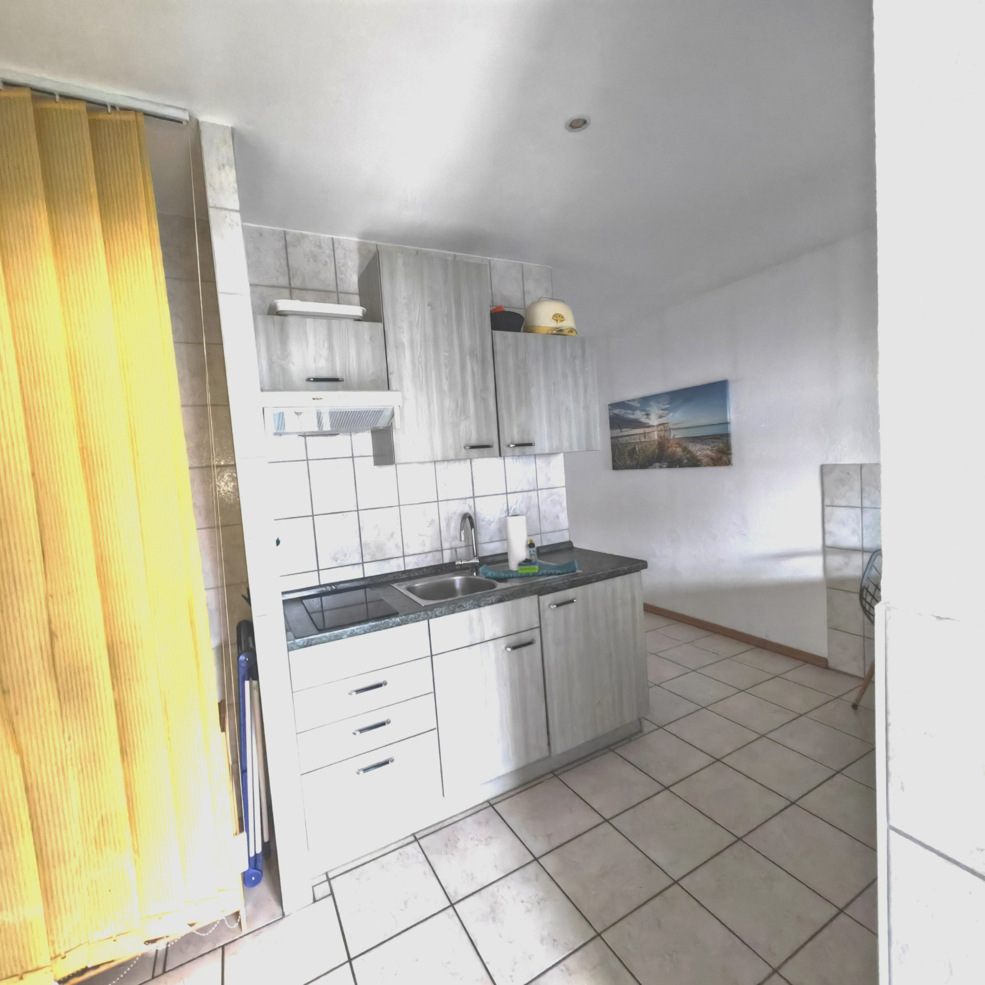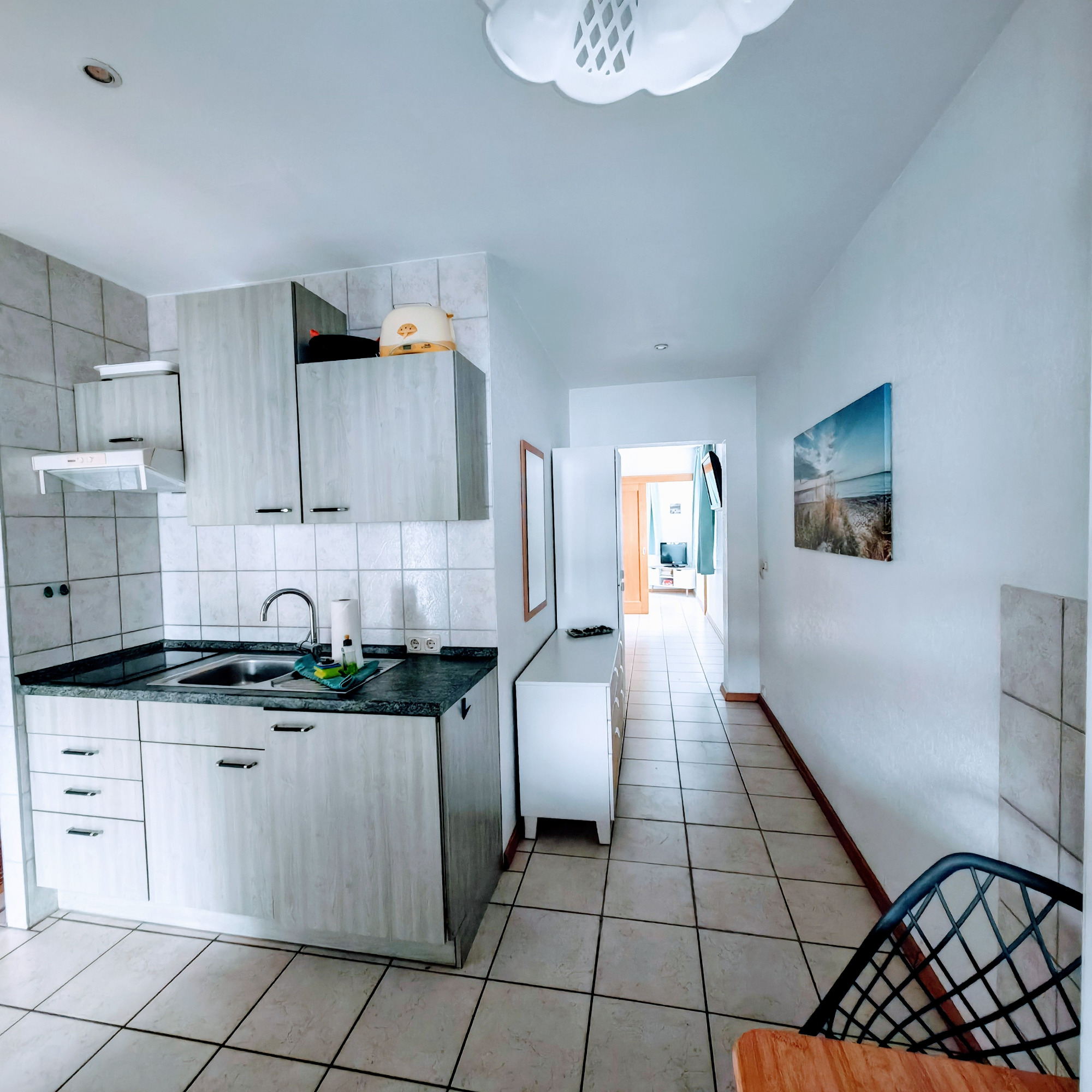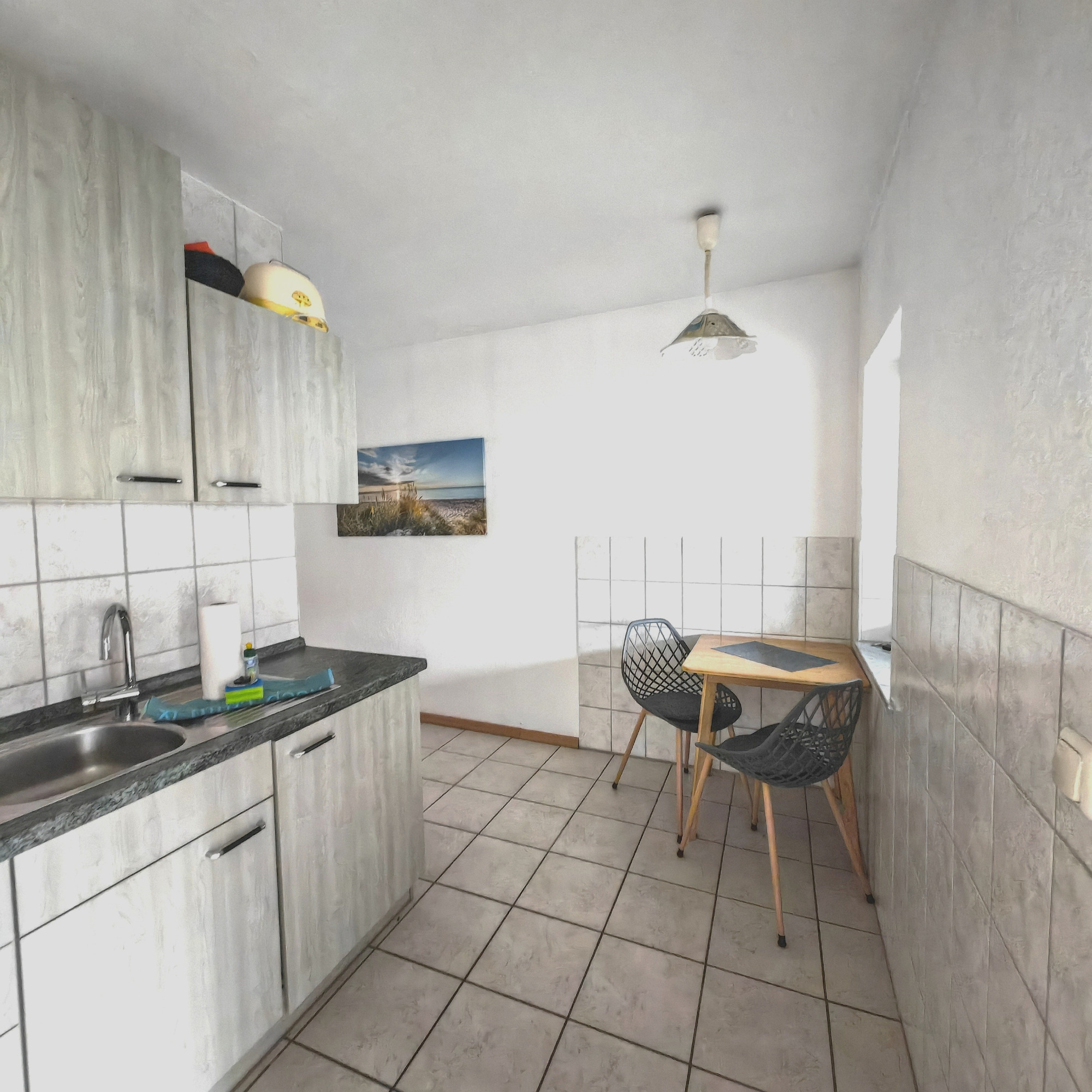 Sie bietet alles, was Sie brauchen: eine praktische Küchenzeile, einen Kühlschrank (ohne Gefrierfach), ein Cerankochfeld mit zwei Platten, Koch- und Essgeschirr, Besteck, Gläser, Wasserkocher, Kaffeemaschine und Toaster. Direkt daneben lädt eine gemütliche Essecke mit Tisch zu gemeinsamen Mahlzeiten ein.